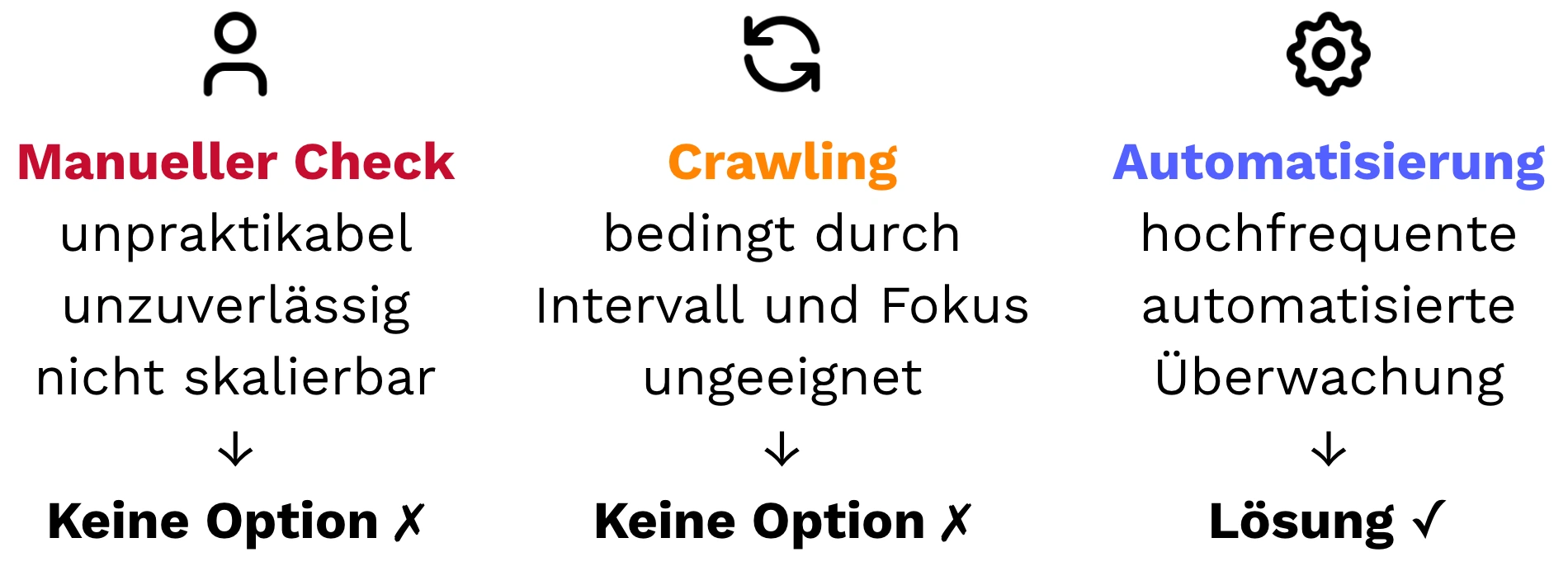 Natürlich sollte die Website regelmäßigen Crawls unterzogen werden, aber das ist in stündlichen oder minütlichen Intervallen weder durchführbar noch wirtschaftlich. Zudem ist die Hauptaufgabe eines Crawlings die Beantwortung struktureller Fragen. Nicht das Aufdecken einzelner technischer Verschlechterungen. Website-Monitoring ist dabei ein Baustein in der Überwachung der Website-Performance mit verschiedenen Monitoring Tools.